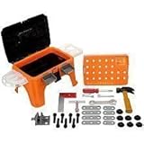 This 40-piece Home Depot Step Stool Workbench, a Toys "R" Us exclusive, is the perfect place to stash all of your little guy's tools! The plastic workbench features a convenient carry handle for on-the-go use, and it opens to reveal a removable basket with a weights-and-measures table on the lid. Underneath the lid, he'll find everything an aspiring handyman needs to get the job done, including a hammer, wrench, screwdriver, nails, screws, bolts, nuts, bolt fastener, and accessories. The large, durable plastic pieces are perfect for small hands. The basket of tools can be removed so the versatile workbench can be used as a step stool. Dimensions: 11.5"L x 9.5W x 7.5"H. Set weight: 2.5 lbs.